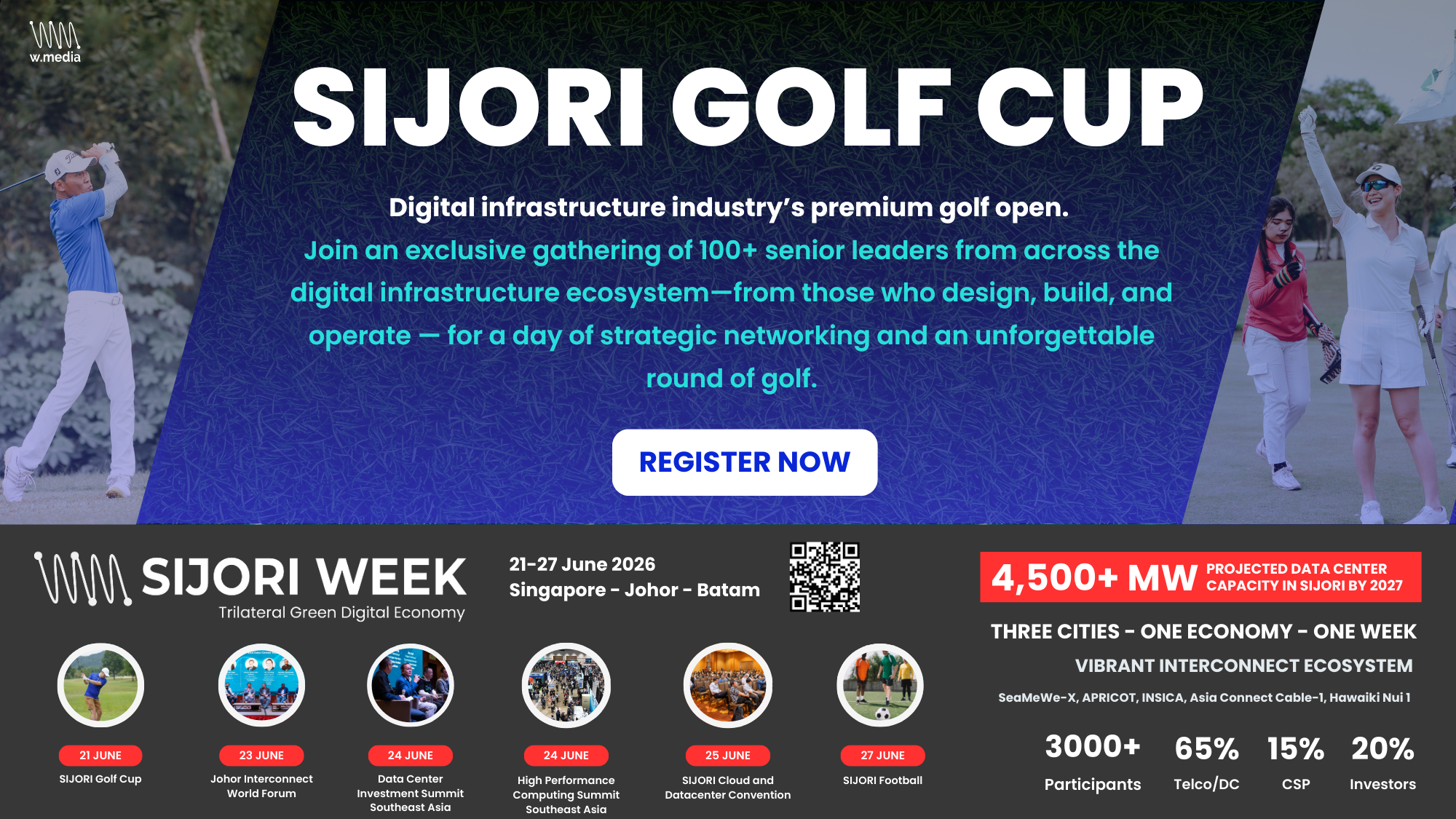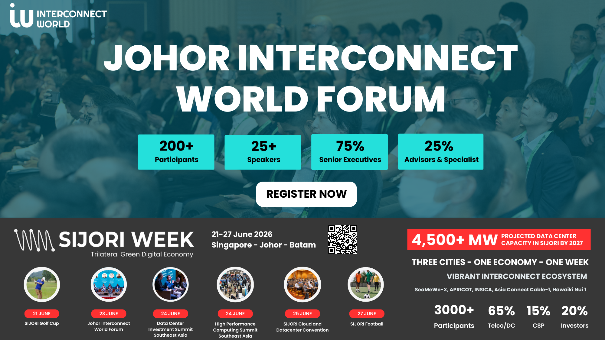 With more than 15 industry-leading companies as sponsors, the event features a lineup of six exciting activities. Highlights include a Golf Open in Batam, Interconnect World in Johor, networking drinks, High Performance Computing Summit, SIJORI Cloud and Datacenter Convention, and the Data Center Investment Summit, as well as some Football in Singapore to wrap everything up.